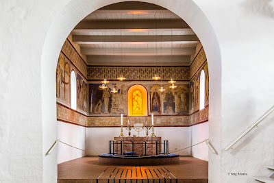 Målningarna i koret har gått förlorade men rekonstruerades 1875 av J. Magnus-Pedersen. Han uppfattade dem som scener från Jesu födelse. Men dagens forskare anser att de har visat Johannes döparens liv! Download. |